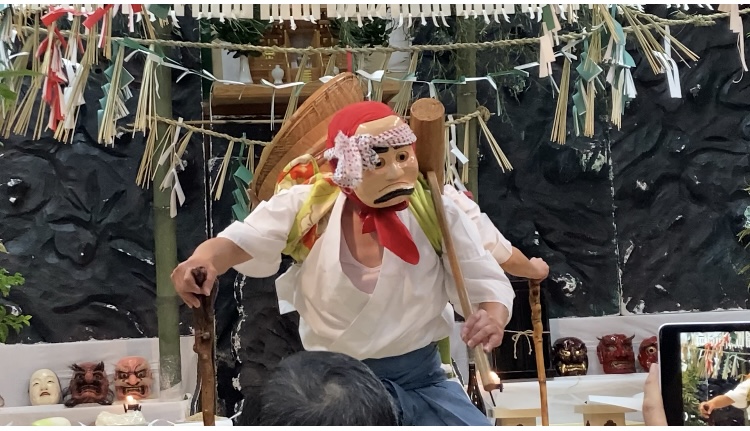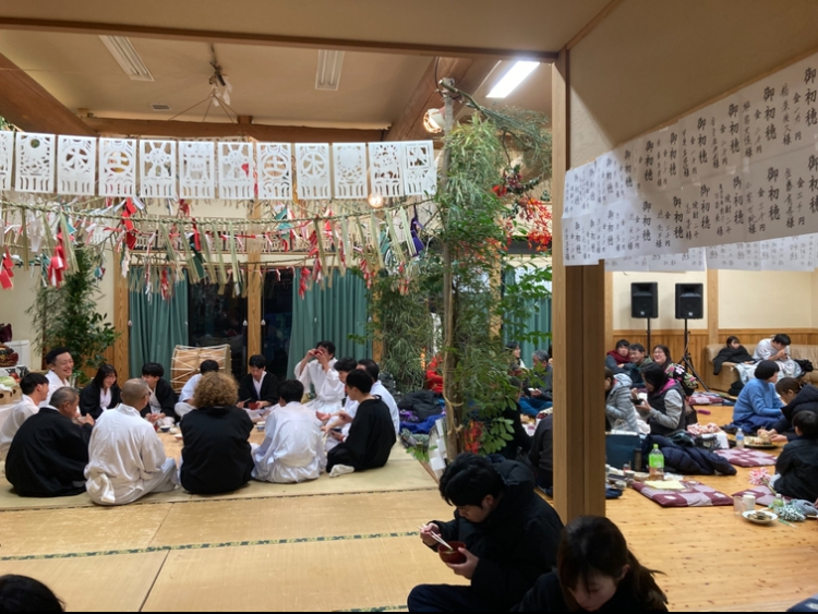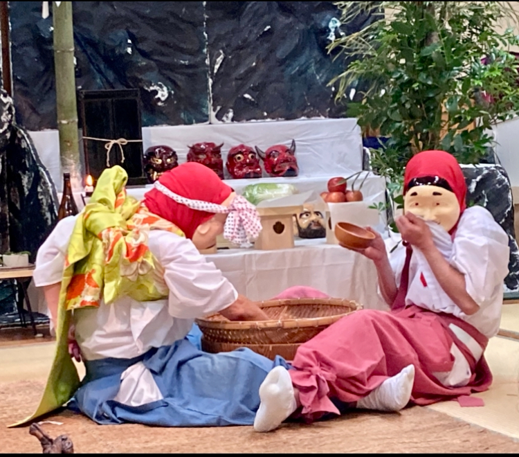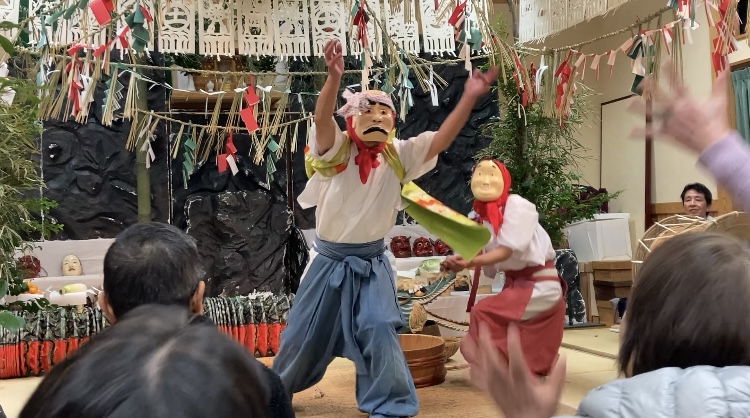 The highlight at midnight is called Sakekoshi or Goshintai, which is one of 33 programs going from 4:00 p.m. to 9:30 a.m. the next day without a single break. In between shows, spectators and dancers are served with supper and breakfast; guests are also provided with alcohol, and they might also take a nap right in front of the stage whenever they need to. This time, the event takes place in a local communal center, in which all spectators and dancers mix well together.