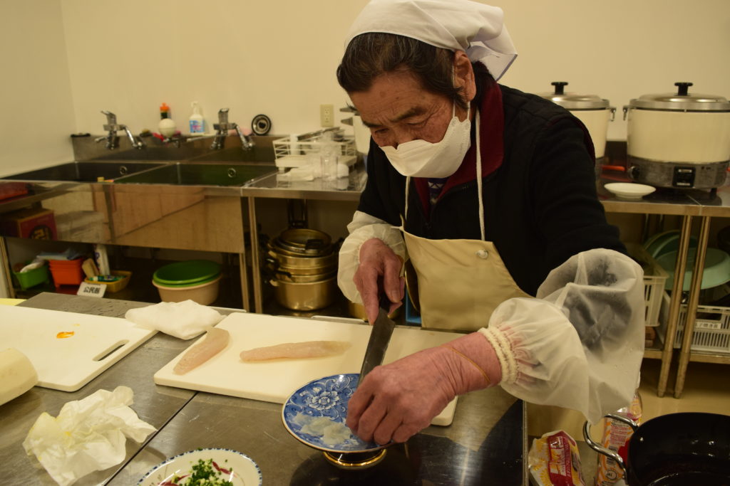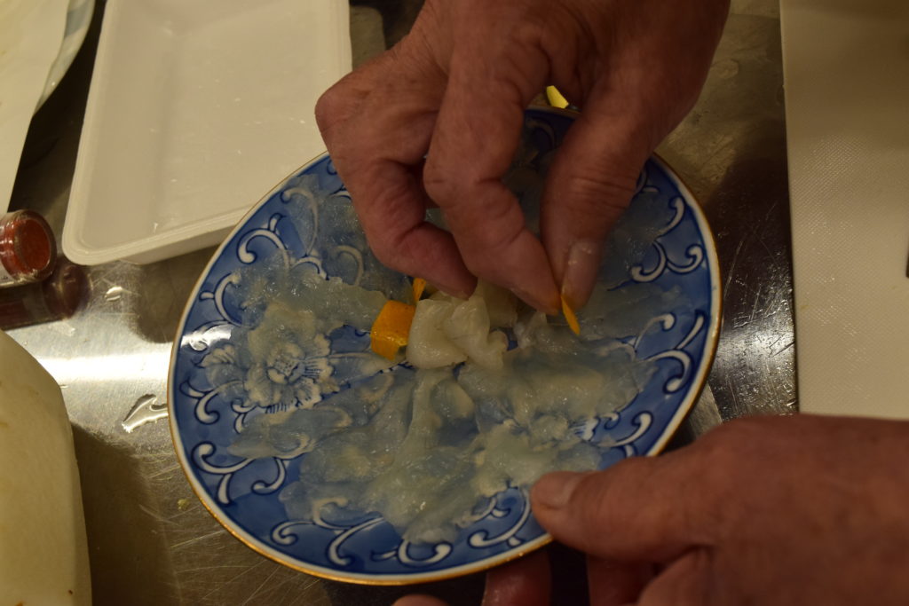 For a cooking session, we move from the Kamimuras’ processing facility to a communal facility with a kitchen. There, Taeko tells me how to cut migaki and arrange the translucent slices in a lovely flowery pattern on a plate. For this type of fish (mafugu), she says, “the knack is ‘to slice thicker than torafugu (tiger fugu)’ as it will taste much better”. After creating a few slices, she lets me do the same. As the fish is so sinewy and firm, I find it so hard to slice. I struggle with a few strips, which end up in a different size and thickness, and my heart almost breaks. Seeing me crestfallen, Taeko cheers me up and says I am getting much, much better.