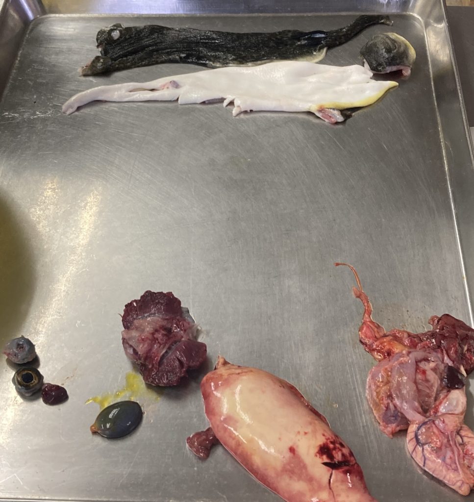 Akino places the skin and internal organs of the fugu on a metal tray, labeling them as “inedible parts”. Edible parts are the toxin-free muscles.